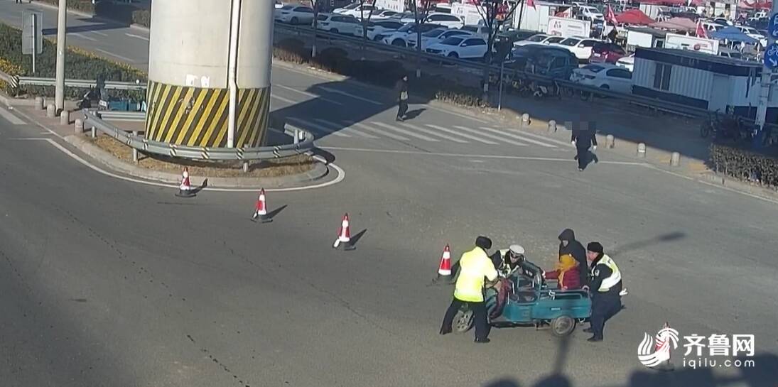 1月22日上午9点左右,青岛黄岛交管大队民警在路口执勤时,一辆电动三轮车忽然失控,驶入主干道,车上还载着一名白叟,白叟不知所措地大声呼叫,状况非常危殆。
